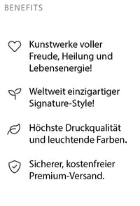 Hier findest du einzigartige Plakate voller Magie und Lebensfreude! Die hochwertigen Drucke entstehen aus handgefertigten Kunstwerken, die mit Liebe & Weisheit versehen sind. Die leuchtenden Fine Art Prints sind in verschiedenen Größen erhältlich. So kannst du dein Zuhause, dein Studio oder deinen Arbeitsplatz im Handumdrehen in einen magischen Kraftort verwandeln!